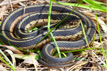 Garter snakes are anywhere from 18 to 21 inches long and come in various colors and patterns, ranging from checkered turquoise to striped yellow, black, and brown. They are typically found in meadows, woodlands, hillsides, and marshes.